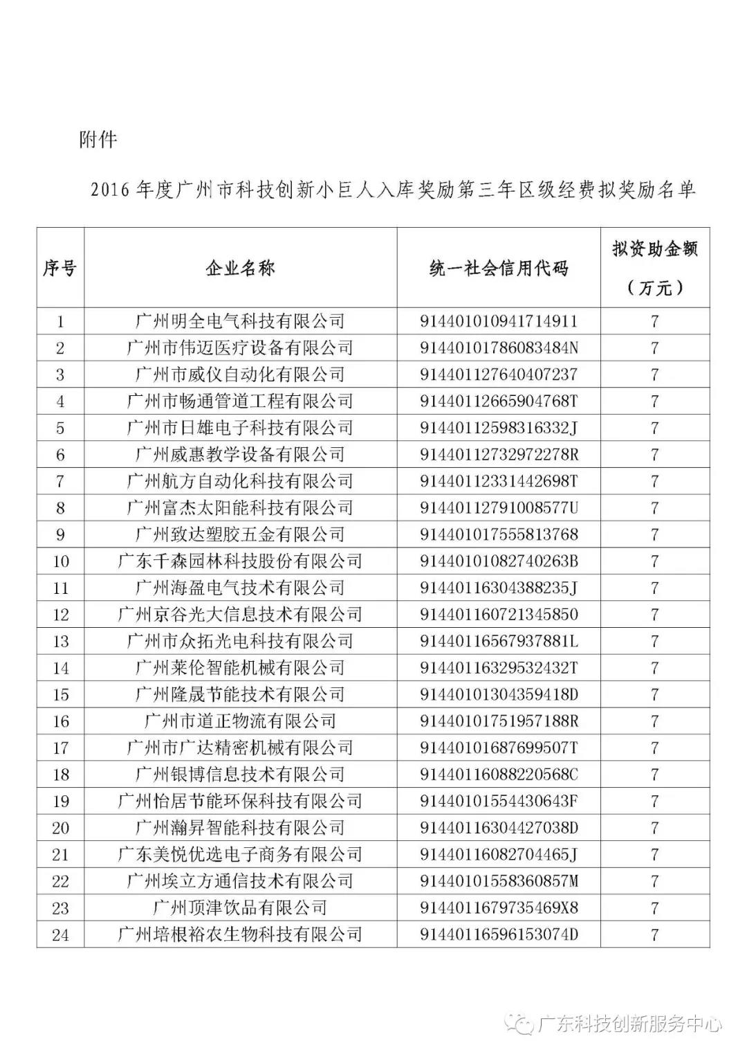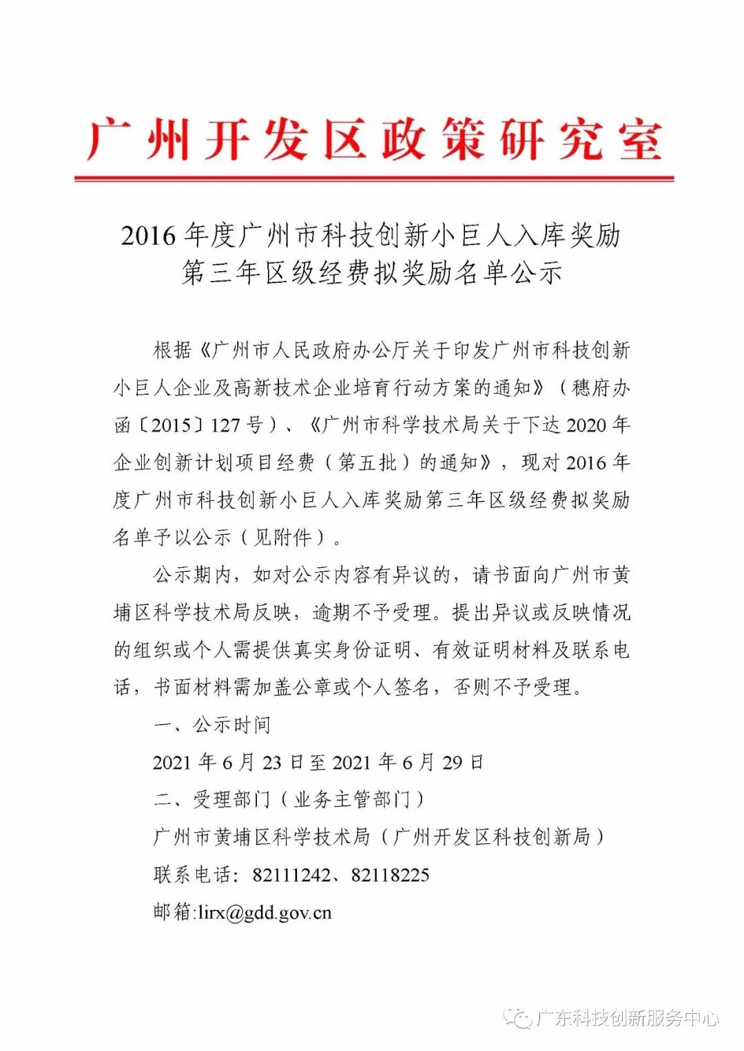 广州市科技创新小巨人入库奖励第三年区级经费拟奖励名单公示