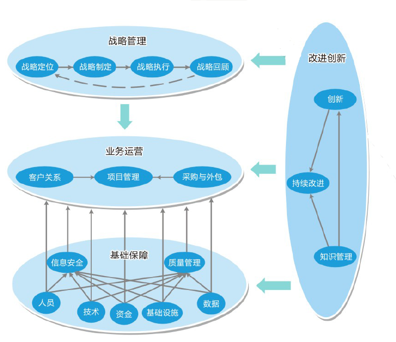 信息系统建设和服务能力评估能力框架是信息系统建设和服务能力的逐层分解,由战略管理、业务运营、基础保障、改进创新四个能力域构成,共包含:4个能力域、17个能力子域、46个能力项、168条能力要求、17个度量项。